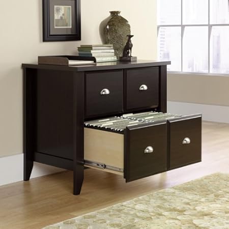 Sure, lots of office and home furnishing manufacturers can help you create an organized, comfortable and fashionable place to live. But Sauder provides a special kind of furniture that is practical and affordable, as well as attractive and enduring. As North America's leading producer of ready-to-assemble furniture, we offer more than 500 items that have won national design awards and generated thousands of letters of gratitude from satisfied consumers. Features: Hidden storage behind simulated drawer fronts/doors Lower drawer features full extension slides and holds letter, legal, or European size hanging files Quick and easy assembly with patented T-lock drawer system Jamocha Wood finishSpecifications: Dimensions: 34.75" (88.4cm) H x 21.63" (54.9cm) W x 30.5" (77.5cm) D Weight: 125.517 lbs.